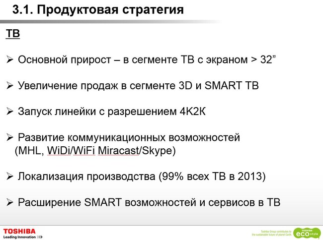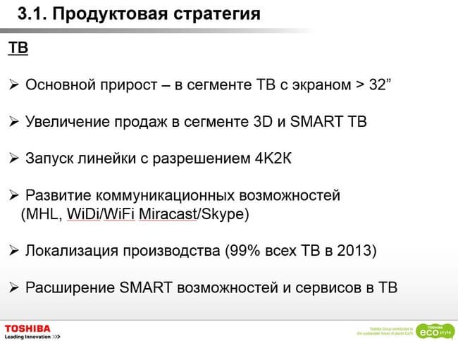 В сфере телевизоров Toshiba также не хочет сосредотачиваться на ценовой конкуренции, предпочитая делать упор на качестве и технологических возможностях новых моделей. При этом компания стремится максимально насытить современными технологиями не только дорогие флагманские модели, но и всю линейку, включая бюджетные модели. В частности, все телевизоры, даже самые дешевые модели, поддерживают новейшие коммуникационные стандарты, такие как MHL.