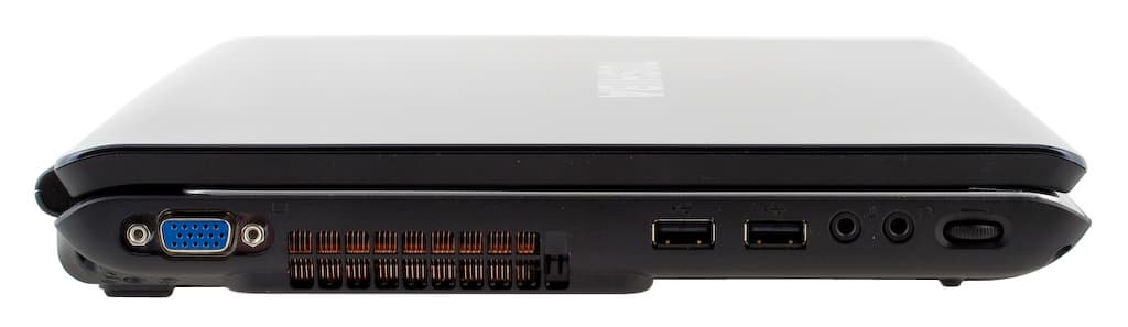 На левой грани расположены: VGA-выход, выхлопная решетка вентиляции, два порта USB, аудиоразъемы (без цветовой маркировки), колесико регулировки громкости. Колесико чрезвычайно поднимает удобство работы с ноутбуком: отрегулировать или приглушить звук можно очень быстро и, не отвлекаясь от других дел. Плюс, колесико расположено удобно, его легко найти на ощупь.