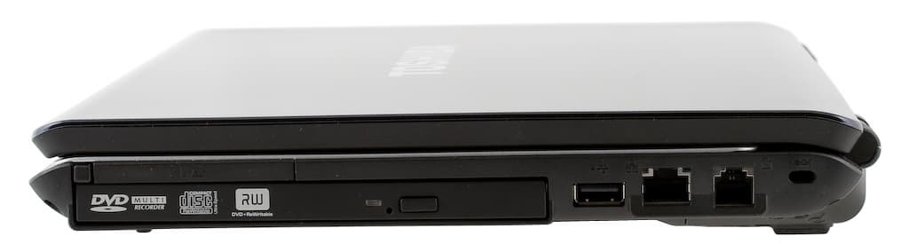 На правой грани расположен оптический привод, занимающий большую часть панели. Над ним расположен слот Express-card. Справа от привода расположен еще один слот USB, а также сетевой и модемный разъемы. В целом, расположение удобно, с приводом можно работать правой рукой, сетевые порты отнесены ближе к задней части ноутбука, так что провода не очень мешаются под рукой.