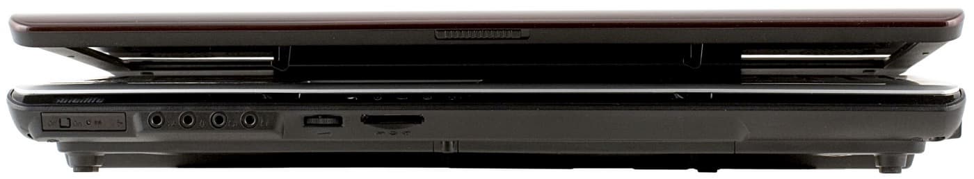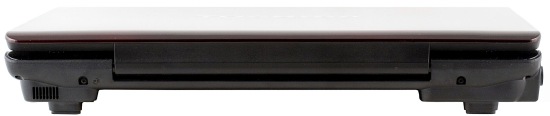 На задней панели ноутбука нет разъемов, так как она прикрывается открытой крышкой. Однако это хорошо, так как в больших ноутбуках крышка закрывается не так часто, и подключение штекеров к разъемам на задней панели достаточно неудобное.
