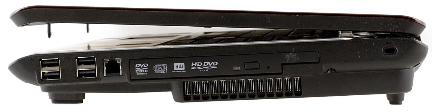 На правом боку расположены: целых четыре порта USB 2.0, сгруппированные по два, разъем для модема и оптический привод. В самом углу — порт замка Кенсингтона. В него вставляется специальная проволочная петля с замком, которой можно пристегнуть ноутбук к чему-нибудь, чтобы его не украли.