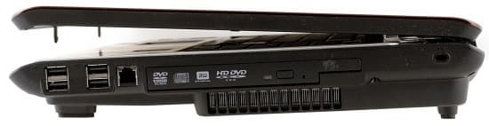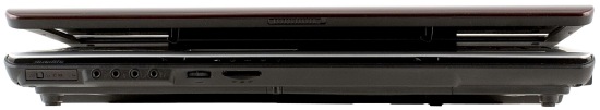 Дальше сгруппированы: разъем для проводной сети RJ-45, два порта USB 2.0, выход S-Video (с 4 штырьками). Еще правее расположен разъем Expresscard, а под ним – цифровой разъем HDMI, а также маленький разъем IEEE1394 FireWire, который используется для подключения электронной бытовой техники.