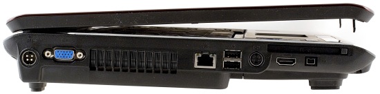 На левой грани, в самом углу расположен штекер питания. Питание подключено практически всегда, то есть штекер и провод будут выступать из ноутбука все время. Но провод можно убрать за ноутбук, и он не будет отвлекать внимание и мешать. Рядом с ним расположен разъем VGA. У VGA-кабелей, как правило, большие штекеры и толстые кабели, поэтому их тоже лучше располагать подальше от пользователя.