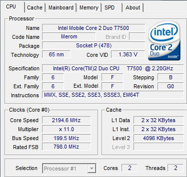 | Процессор | Intel Core 2 Duo T7500, 2,2 ГГц, шина 800 Мгц |