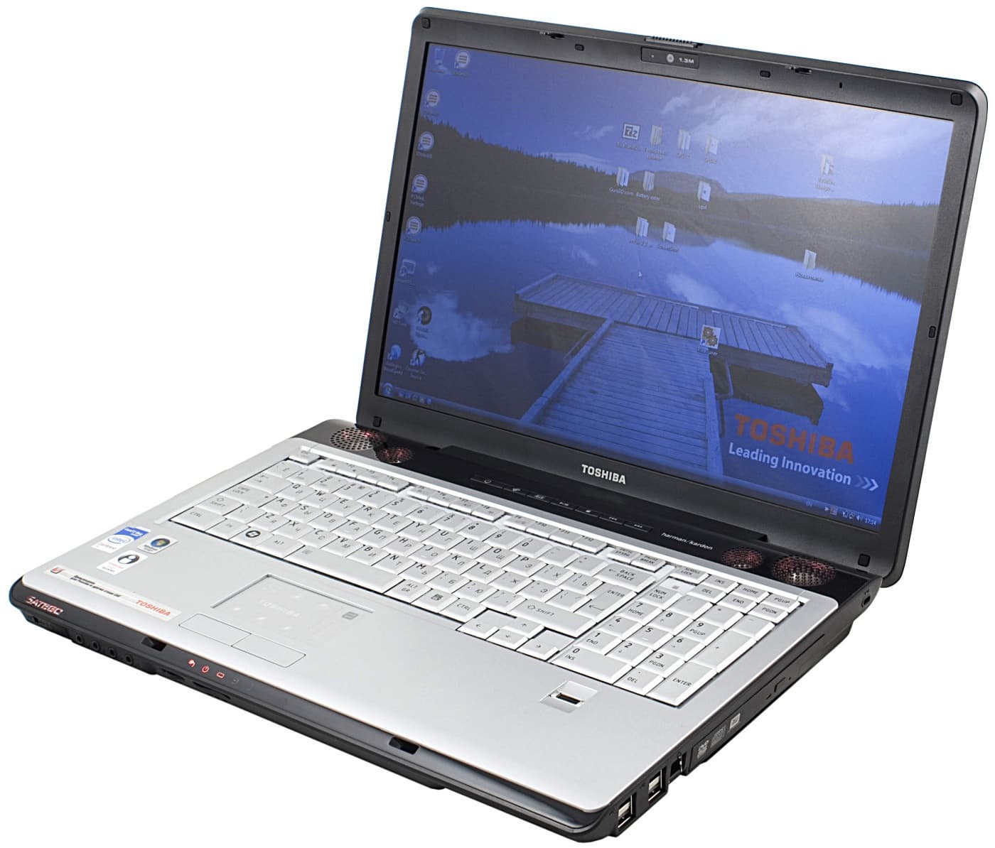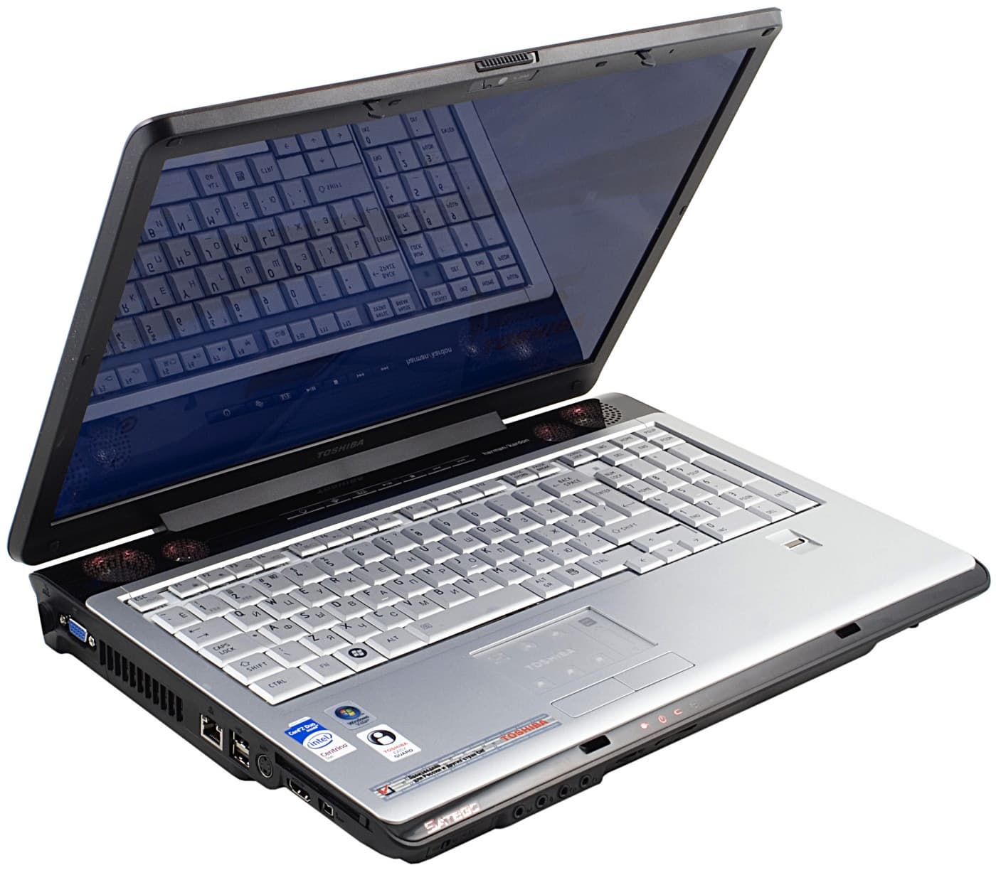 В X200 акустическая система еще улучшена, даже по сравнению с другими моделями Satellite двухсотой серии. В отличие от близкой модели Р200, в ней установлены не два, а четыре динамика, так как разнесены среднечастотные и высокочастотные. Это дает возможность расширить частотный диапазон. В первую очередь, ноутбук значительно лучше воспроизводит высокие частоты. На нижнюю панель выведен динамик, играющий роль сабвуфера. Этот динамик воспроизводит не собственно нижние частоты, а диапазон нижнесредних частот, ждать от X200 глубоких басов не стоит. Кроме того, он играет «в стол», поэтому эффект сильно зависит, например, от того, есть на столе скатерть или нет. Если ноутбук стоит, например, на мягком пледе, то эффект и вовсе нивелируется.