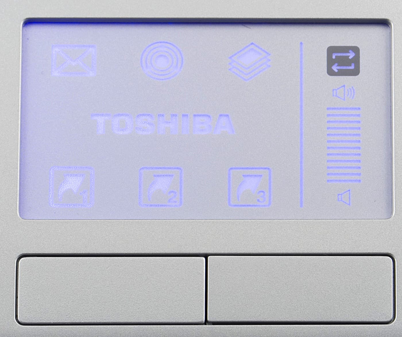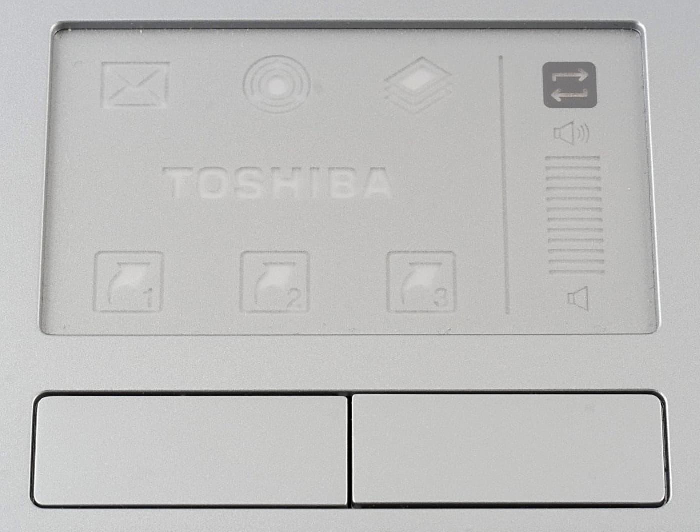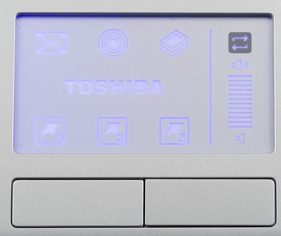 В альтернативном режиме тачпада доступно две функции: быстрый запуск приложений и регулировка громкости. Три верхних «кнопки» закреплены для быстрого запуска приложений, определенных Toshiba (почта, плеер и пр.), три нижних — для запуска трех пользовательских приложений. Толстая полоска справа от тачпада регулирует громкость: для регулировки достаточно провести пальцем вверх или вниз.