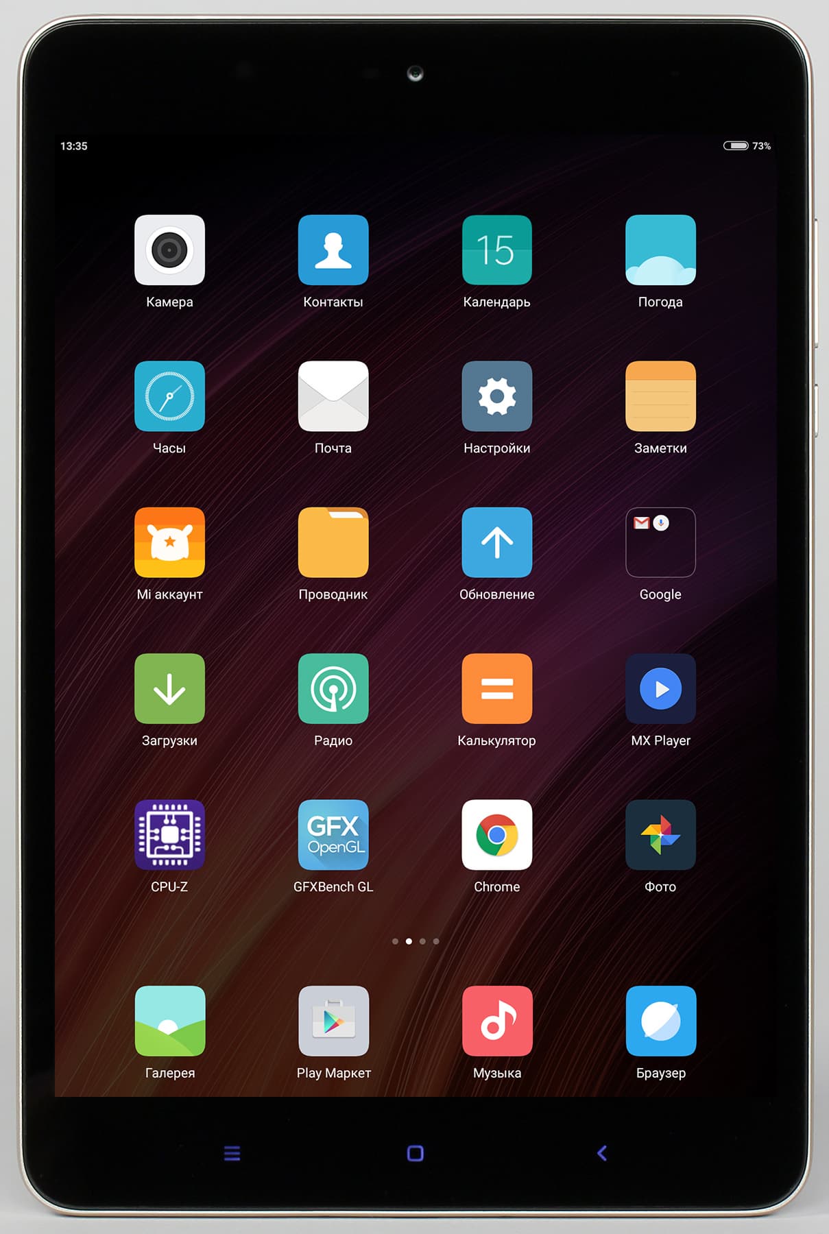 В нижней части под экраном находятся три привычных сенсорных кнопки управления, которые также имеют приятную мягкую белую подсветку. Кнопки, стандартно для интерфейса MIUI, имеют дополнительные функции, исполняемые по удержанию. Все их действия можно самостоятельно переназначить через соответствующее меню настроек. Сканера отпечатков пальцев планшет не получил.