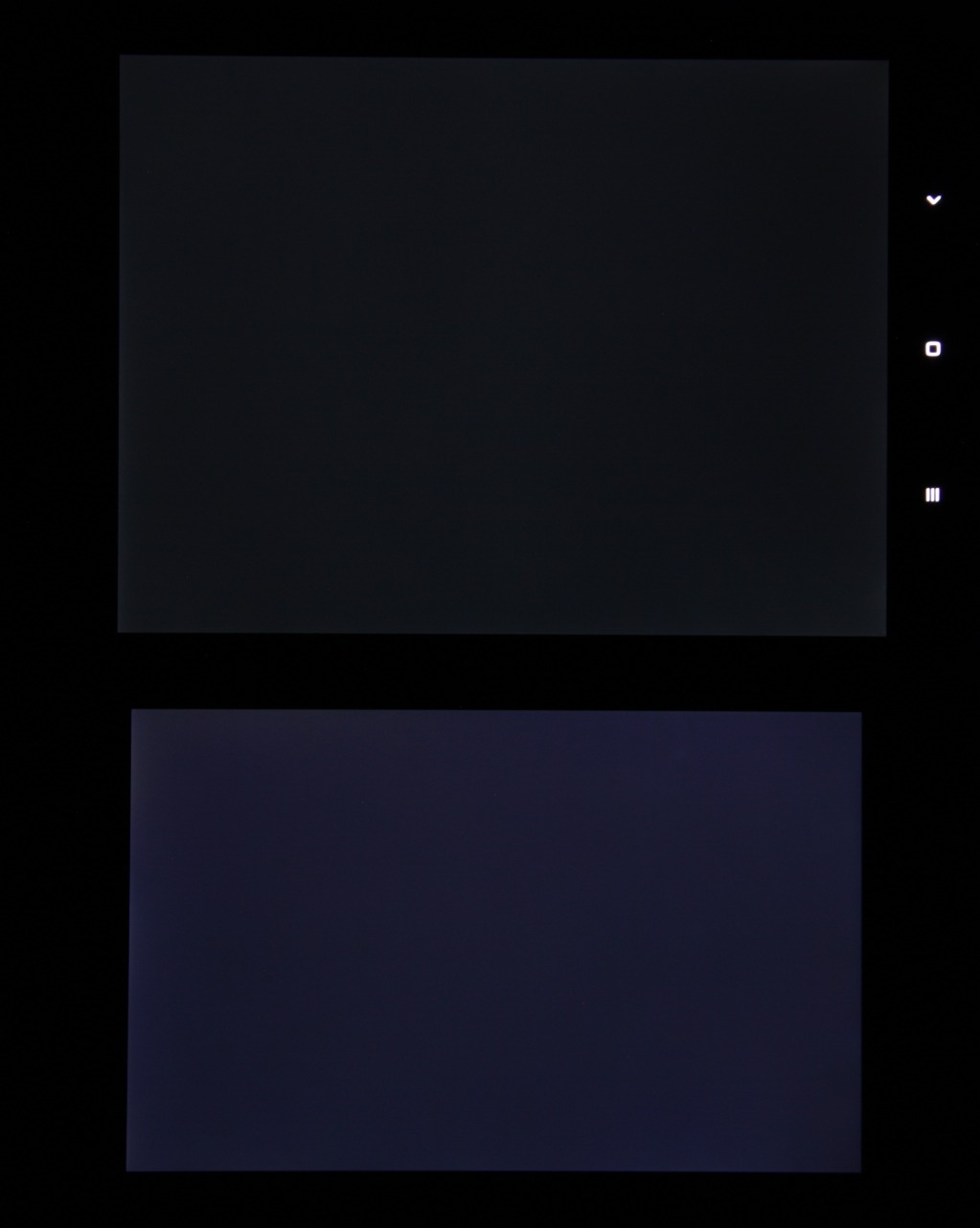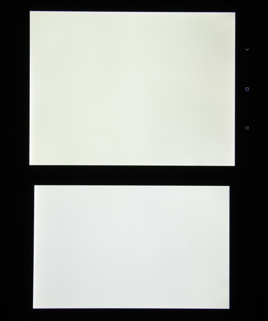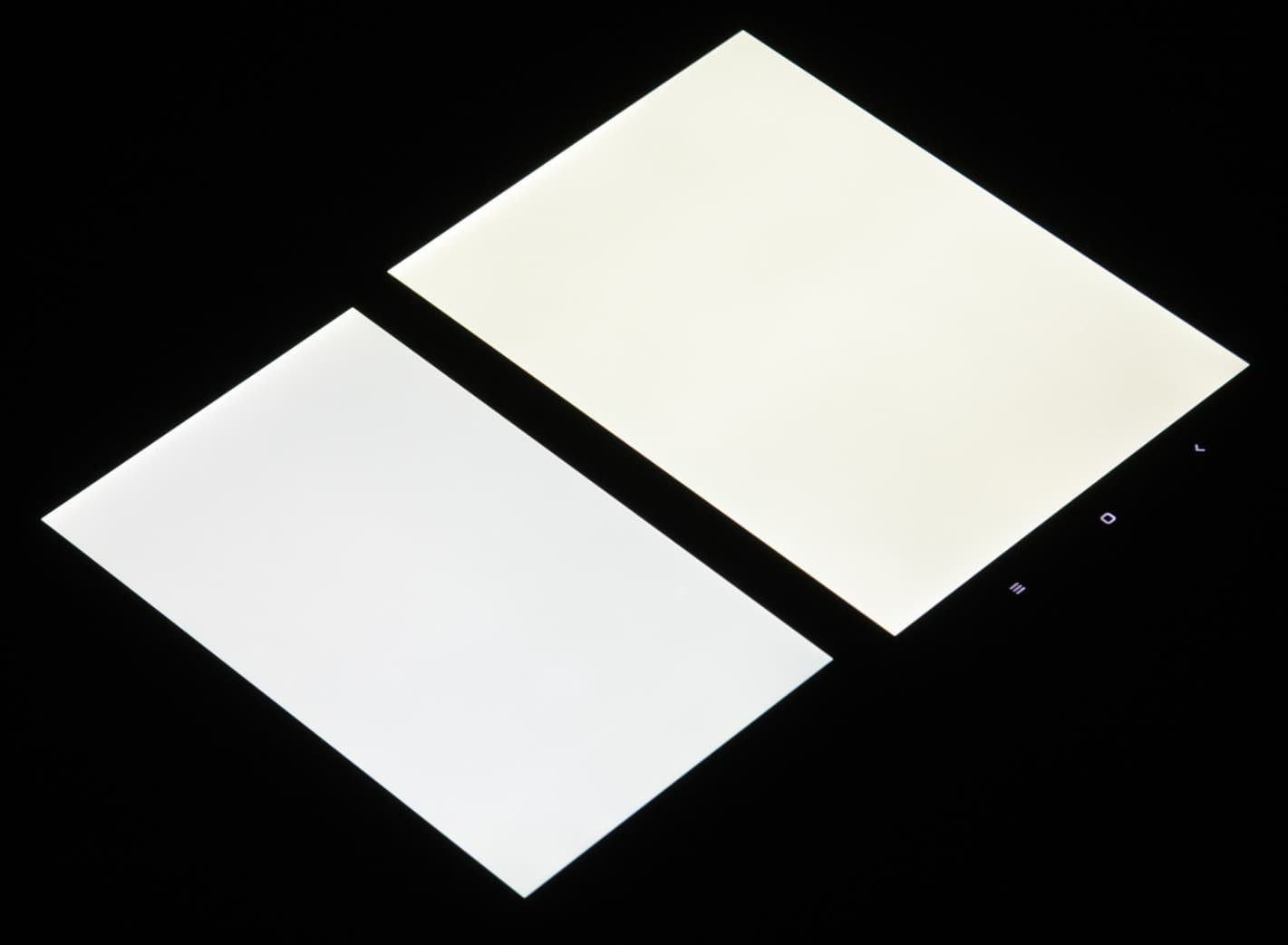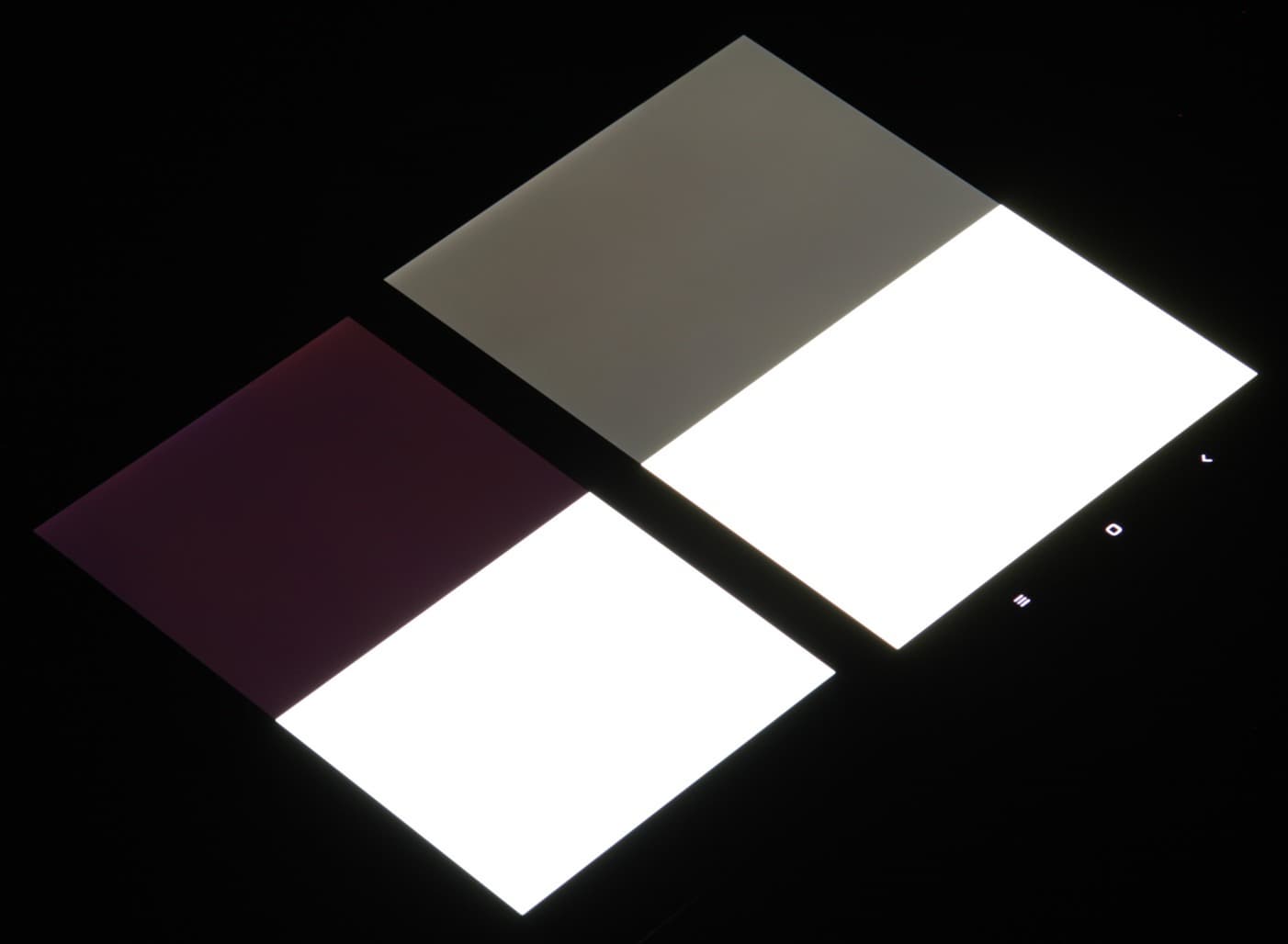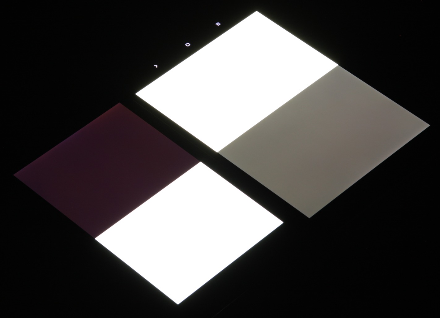 Яркость под углом у экранов уменьшилась, но в случае Xiaomi Mi Pad 3 снижение яркости меньше (чтобы избежать сильного затемнения, для снимков под углом выдержка увеличена в сравнении с предыдущими фотографиями). Черное поле при отклонении по диагонали высветляется сильно, но остается условно нейтрально-серым. Фотографии ниже это демонстрируют (яркость белых участков в перпендикулярном плоскости экранов направлении одинаковая!):
