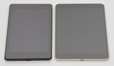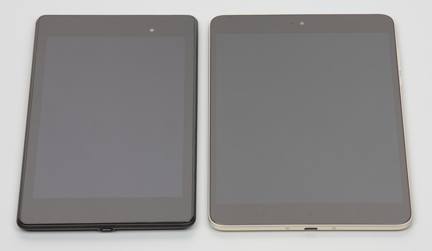 Лицевая поверхность экрана выполнена в виде стеклянной пластины с зеркально-гладкой поверхностью, устойчивой к появлению царапин. Судя по отражению объектов, антибликовые свойства экрана примерно как у экрана Google Nexus 7 (2013) (далее просто Nexus 7). Для наглядности приведем фотографию, на которой в выключенных экранах отражается белая поверхность (слева — Nexus 7, справа — Xiaomi Mi Pad 3, далее их можно различать по размеру, и Nexus 7 на фотографиях располагается под тестируемым устройством):