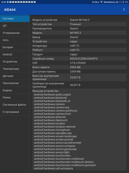 Аппаратная платформа Xiaomi Mi Pad 3 строится на шестиядерной SoC MediaTek MT8176. В конфигурацию чипа входят два процессорных ядра ARM Cortex-A72 с максимальной частотой до 2,1 ГГц и четыре ядра ARM Cortex-A53 с частотой до 1,7 ГГц. За обработку графики отвечает видеоускоритель PowerVR Roque GX6250. Объем оперативной памяти (LPDDR3) в рассматриваемой конфигурации составляет 4 ГБ, а встроенной флэш-памяти (eMMC 5.0) — 64 ГБ. Из них свободно около 3 ГБ ОЗУ и 49 ГБ места в хранилище. Возможность расширения памяти за счет установки карт microSD не предусмотрена.