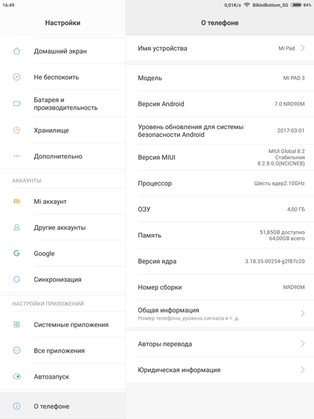 В качестве программной платформы в Xiaomi Mi Pad 3 используется ОС Android версии 7.0 и хорошо знакомая фирменная оболочка MIUI 8 — один из самых популярных альтернативных пользовательских интерфейсов, применяемых в кастомизированных прошивках не только для продукции Xiaomi. В данной прошивке MIUI Global 8.2 присутствуют все сервисы Google и традиционные для смартфонов с Android и MIUI программы, поддерживается русский язык. Естественно, в данном случае оболочка немного доработана с учетом того, что она предназначена для планшета, здесь все перекомпоновано так, чтобы на один экран влезало больше информации и всюду мог быть использован ландшафтный режим просмотра. В остальном же это абсолютно та же самая MIUI 8, которая используется на всех современных смартфонах производителя.