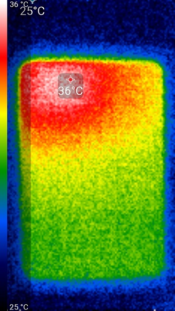Нагрев больше локализован в верхней правой части аппарата, что, видимо, соответствует расположению микросхемы SoC. По данным теплокамеры, максимальный нагрев составил 36 градусов (при температуре окружающего воздуха в 24 градуса), это относительно немного.
