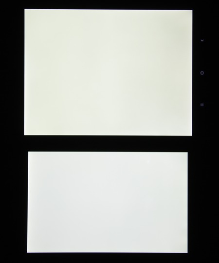 Экран имеет хорошие углы обзора без значительного сдвига цветов даже при больших отклонениях взгляда от перпендикуляра к экрану и без инвертирования оттенков. Для сравнения приведем фотографии, на которых на экраны Xiaomi Mi Pad 3 и Nexus 7 выведены одинаковые изображения, при этом яркость экранов изначально установлена примерно на 200 кд/м², а цветовой баланс на фотоаппарате принудительно переключен на 6500 К.