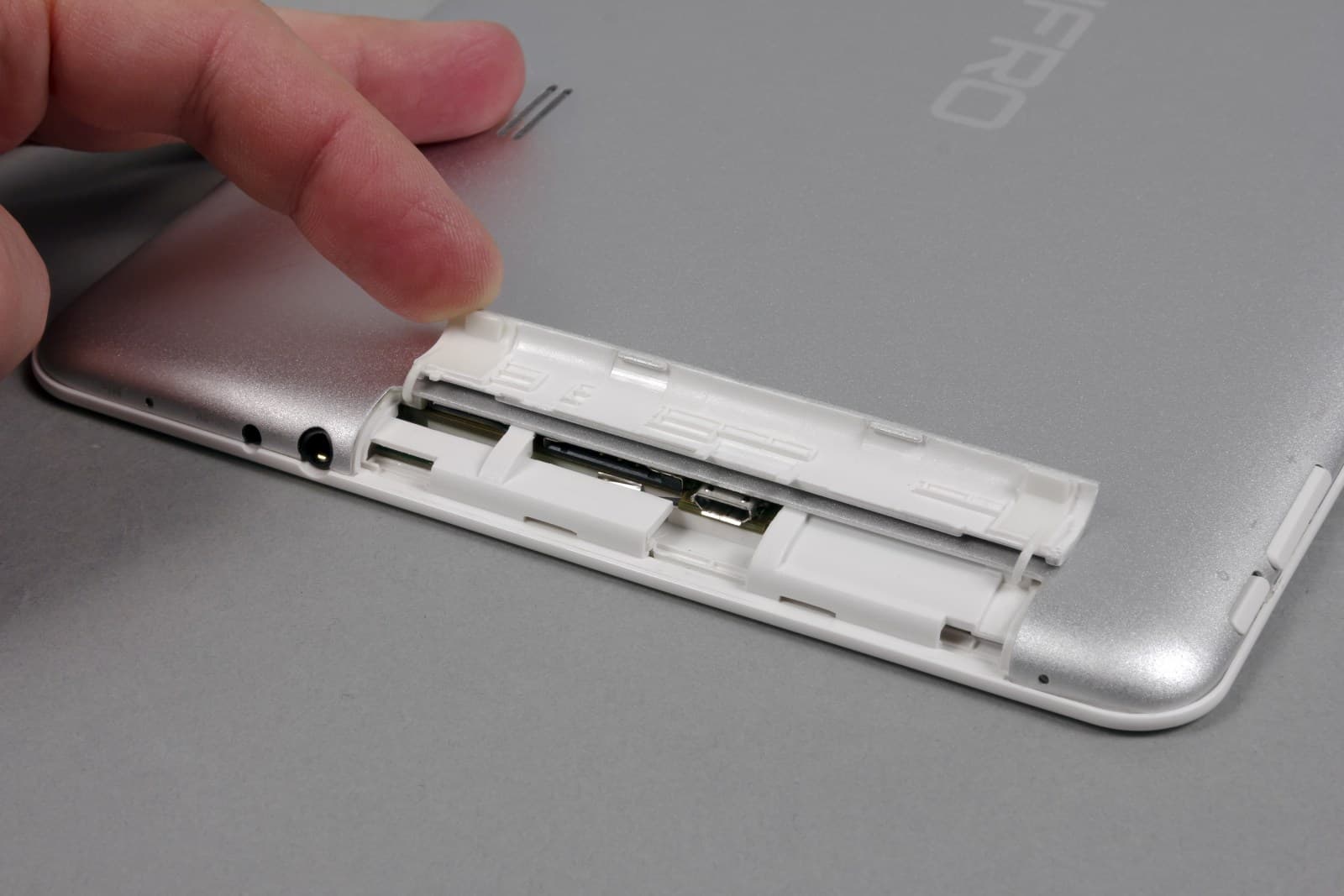 Под пластиковой крышкой находятся разъемы Mini-SIM и microSD, никак не помеченные и потому едва заметные. Рядом — порт Micro-USB. Крышка открывается с трудом, необходимо с силой поддевать прорези на ней ногтем. Через несколько таких операций образуется зазор между ней и тыловой панелью.