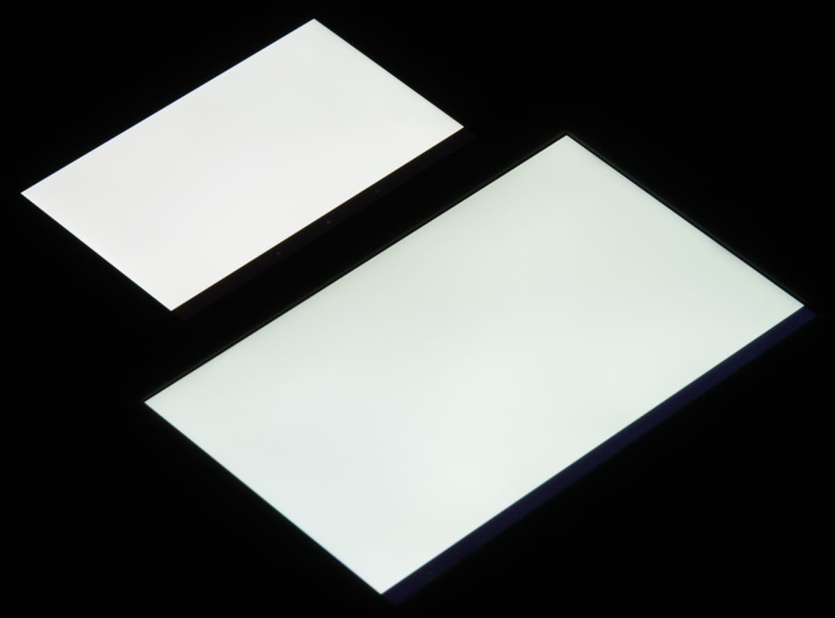 Яркость под углом у обоих планшетов заметно уменьшилась (как минимум в 5 раз, исходя из разницы в выдержке) и падение яркости примерно одинаковое. При этом цветовой тон изменился несильно. Черное поле при отклонении по диагонали высветляется очень сильно и приобретает красно-фиолетовый или фиолетовый оттенок. Фотография с Nexus 7 для сравнения это показывает (яркость белых участков в перпендикулярном направлении у обоих планшетов одинаковая!):
