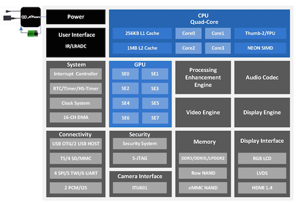 В состав однокристальной системы входят четыре ядра ARM Cortex-A7, работающих на частоте до 1 ГГц. Дополнительно предусмотрена интегральная схема управления питанием. За графику отвечает двухъядерный PowerVR SGX544, поддерживающий OpenGL ES 2.0, OpenCL 1.x и DirectX 9.3.