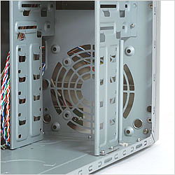 Кроме того, в этом корпусе можно разместить до четырех системных вентиляторов: один (опциональный, диаметром 120 мм или 80 мм) — на передней панели шасси (соответствующие посадочные места предусмотрены, см. фото),