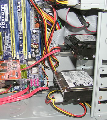 Впрочем, здесь мы подошли к необходимости нашей первой оптимизации корпуса R201. Блок питания в этот раз трогать не будем — он и так тих и достаточно эффективен по отводу теплого воздуха из корпуса (особенно вместе с рядом работающим на задней стенке системным пропеллером ;)). А на винчестеры имеет смысл обратить внимание — если почти простаивающий системный диск WD800JD разогрелся до вполне допустимых 44 градусов, то чересчур активно работающий (фактически — в режиме серверной нагрузки) SATA-винчестер Hitachi Deskstar 7K400 накалился до предела — 55 градусов по спецификациям являются его критической рабочей температурой, хотя и измеренной не по встроенному термодатчику, а как предельно допустимая «температура окружающей среды». Так что по внутренней температуре диск может работать, видимо, и выше. Но рисковать мы не станем, и перенесем второй системный вентилятор (который находился на левой боковой стенке под патрубком) в переднюю часть системного блока — перед установленным во второй с самого низу трехдюймовый отсек диском Hitachi. Впрочем, все же слегка затронем и блок питания — для улучшения отвода теплого воздуха из корпуса заклеим широким скотчем отверстия на «внутренней» стенке блока питания (см. выше). И посмотрим, что из этого получилось: