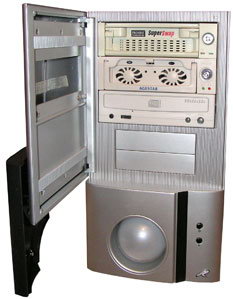 Дверка, в закрытом положении удобно фиксируемая двумя магнитами, прикрывает «богатство» отсеков для установки дисководов и другой периферии — три пятидюймовых и два трехдюймовых слота.