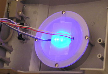 внутри которой расположены два синих светодиода, помещенных в матовый наполнитель, так что свет рассредоточен по всей полусфере.