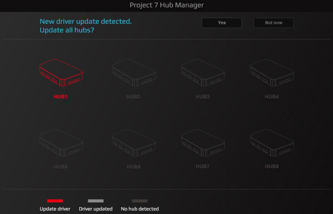 Но вернемся к программе. Заключительным этапом ее установки является проверка обновлений драйвера, причем открывшееся окно явно дает понять, что хабов, управляемых программой, может быть до восьми, и становится понятным назначение переключателя, находящегося возле выходящих из корпуса хаба кабелей: он задает индивидуальный номер на случай, если хабов в системе больше одного.