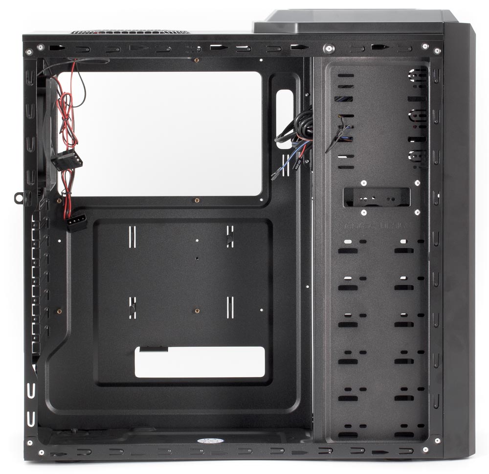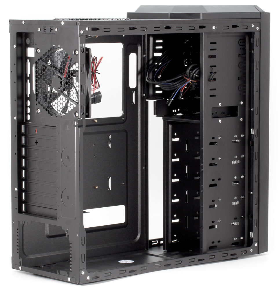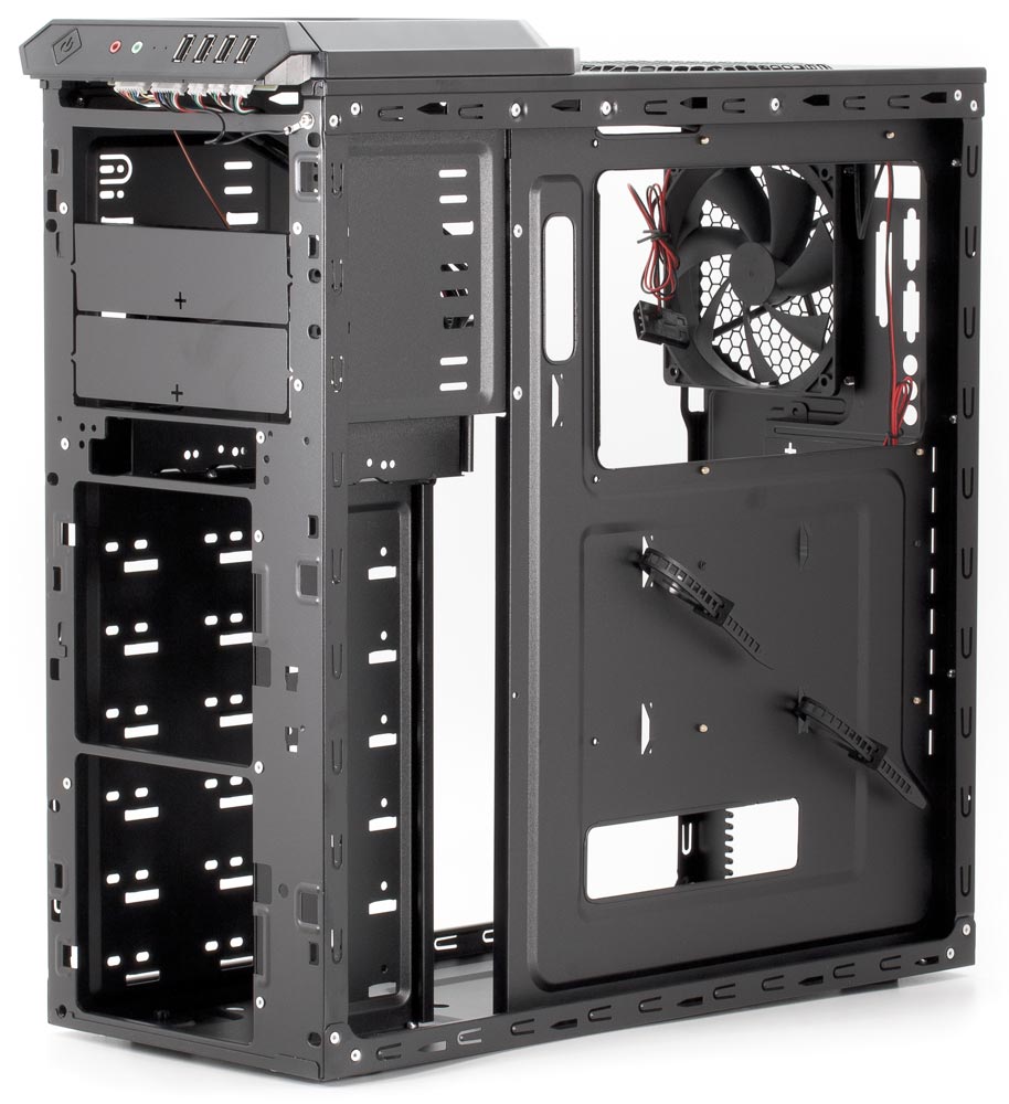 Шасси изготовлено из 0,6-миллиметровой стали, поэтому жесткость конструкции не очень высокая. Боковые стенки чуть толще — 0,7 мм; правая стенка сплошная, а в левой предусмотрены лишь отверстия для одного вентилятора, поэтому жесткость этих крышек достаточна, чтобы не возникало перекосов при их установке.