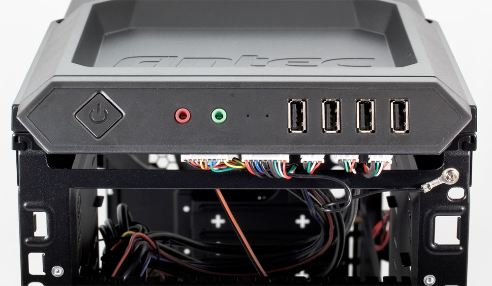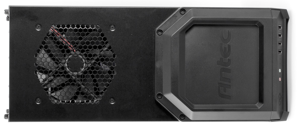 Верхняя крышка корпуса металлическая, но передняя ее часть занята пластиковой накладкой, образующей удобный лоток с высокими бортиками. Примыкающая к лицевой панели грань этой накладки скошена, и на ней разместились четыре разъема USB 2.0, индикаторы питания и активности HDD (оба синего цвета), два аудиоразъема и кнопка включения; кнопки Reset не предусмотрено. Таким образом, доступ к этим элементам будет удобным при любом размещении корпуса — и на столе, и под столом. Разъемы USB расположены с шагом 14 мм (для сравнения: на материнских платах шаг составляет 8,5–9 мм), поэтому в них можно будет одновременно подключать достаточно габаритные устройства.