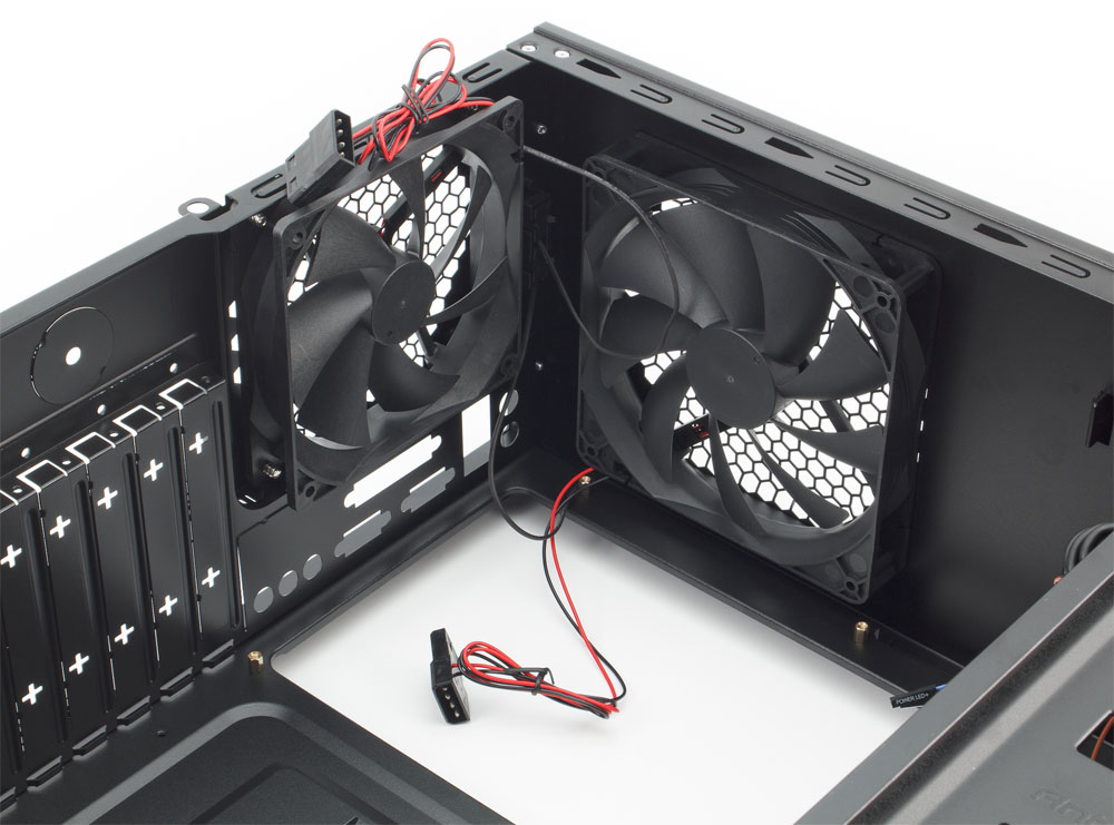Корпус можно оснастить пятью вентиляторами: двумя 120-миллиметровыми на лицевой панели, по одному такого же размера на левой крышке и на задней панели шасси, а также одним 140-миллиметровым на верхней крышке. Первые два из перечисленных крепятся пластиковыми защелками, остальные — саморезами.