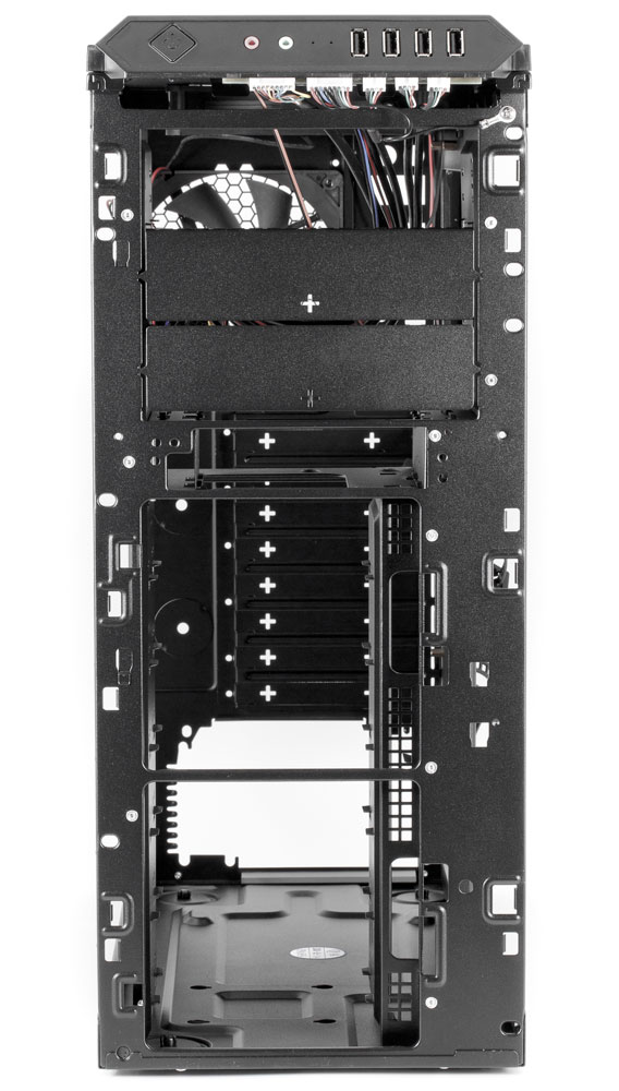 Передняя панель имеет почти сплошную перфорацию: бо́льшая ее часть закрыта пластинами из металлической сетки, имитирующими заглушки 5-дюймовых слотов. Собственно, три верхних пластины такими заглушками и являются, а в четвертой установлена заглушка для 3,5-дюймового устройства.
