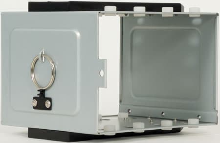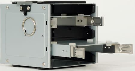 Жесткие диски в маленькую корзину устанавливаются на съемные поддоны с силиконовыми демпферами. То есть крепеж идет через отверстия на нижней стенке HDD четырьмя специальными винтами. Сами поддоны держатся в корзине только за счет силы трения, но держатся очень хорошо.