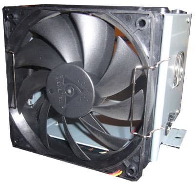 Вентилятор типоразмера 120 мм в центре нижнего отсека, а также у фронтальной панели перед маленькой корзиной для жестких дисков устанавливается через съемную пластиковую рамку, к которой он прикручивается четырьмя винтами. Далее, рамка задвигается на её законное место и защелкивается. Фиксация такого крепления получается надежная, однако следует отметить, что снять рамку с нижнего отсека получается намного сложнее, чем с верхнего. При её снятии следует проявить аккуратность, дабы не повредить хрупкий пластиковый "рычаг".