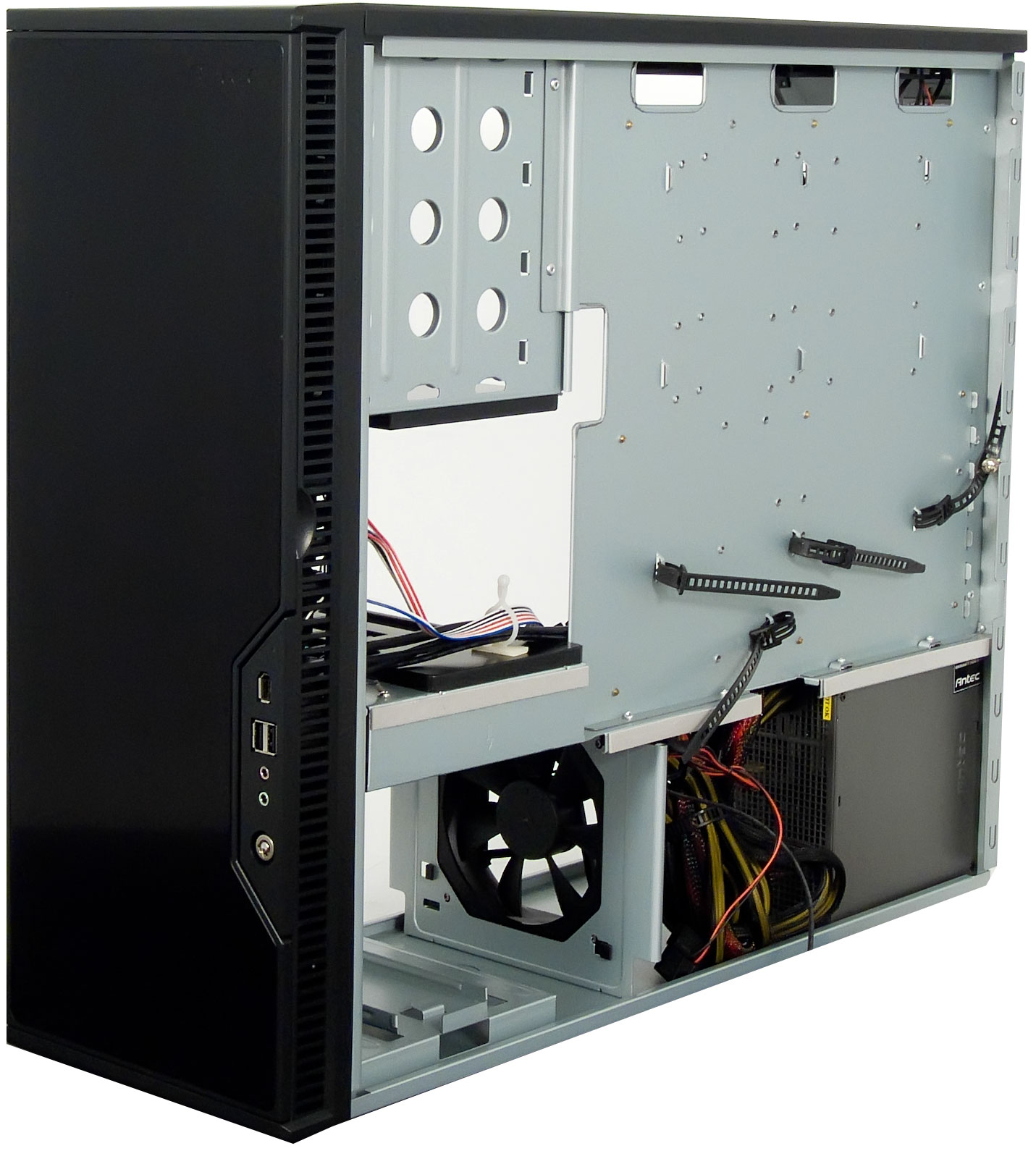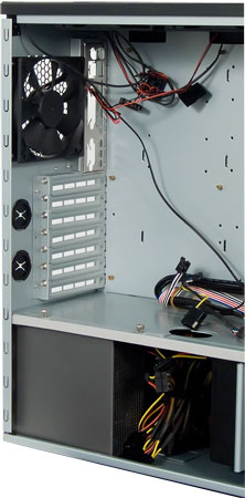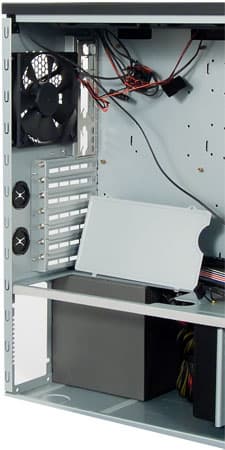 Несмотря на то, что блоки питания располагаются в нижней части корпуса, их провода можно довольно аккуратно уложить, используя еще одну фирменную технологию Antec — Cable Management. Суть её в том, что основные жгуты проводов пропускаются с оборотной стороны подложки материнской платы, после чего выводятся через специальные прорези. Провода у комплектных блоков питания очень длинные, поэтому подключить таким образом основной разъем ATX, дополнительный ATX12V, а также оптический привод в верхнем пятидюймовом отсеке можно без каких-либо затруднений.