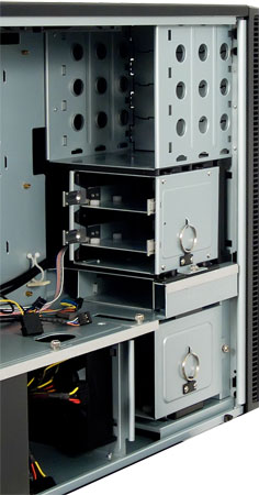Устройства в пятидюймовый отсек устанавливаются через салазки из прочного пластика, которые фиксируются на оборудовании с помощью двух винтов под крестовую отвертку. Произвести установку оптического привода можно без снятия передней декоративной панели. Фиксация привода в отсеке только за счет салазок (без дополнительной винтовой фиксации) очень прочная. Извлечь привод можно, прижав ушки салазок к устройству до характерного щелчка, затем просто потянув его на себя. Отметим, что здесь уже трудно будет обойтись без снятия декоративной передней панели — салазки нужно прижимать большими пальцами со значительным усилием.