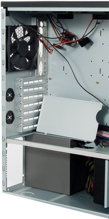 А в нижнем отсеке сборщику придется помучиться с подводкой питающих кабелей к нижней корзине для жестких дисков. Подвести провода напрямую мешает разделяющий нижний отсек вентилятор, и в результате, нужно или любыми силами пытаться их протиснуть или забыть об аккуратном внешнем виде и вести провода поверху. В любом случае, незадействованных проводов на втором БП остается очень много, и их, скорее всего, потребуется выводить наверх. В противном случае, о нормальном температурном режиме в этом отсеке не может быть и речи.