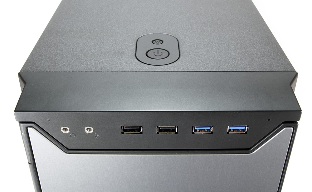 Разъемы расположились горизонтальным рядом в верхней части лицевой панели, которая не закрывается дверцей. Перечислим их слева направо: пара аудиоразъемов, два порта USB 2.0 и два USB 3.0. По краям есть два крошечных отверстия, за которыми скрываются индикаторы питания и активности HDD (оба синего цвета). Разъемы USB расположены горизонтально и с интервалом всего 11 мм, поэтому с одновременным подключением достаточно широких устройств будут проблемы.