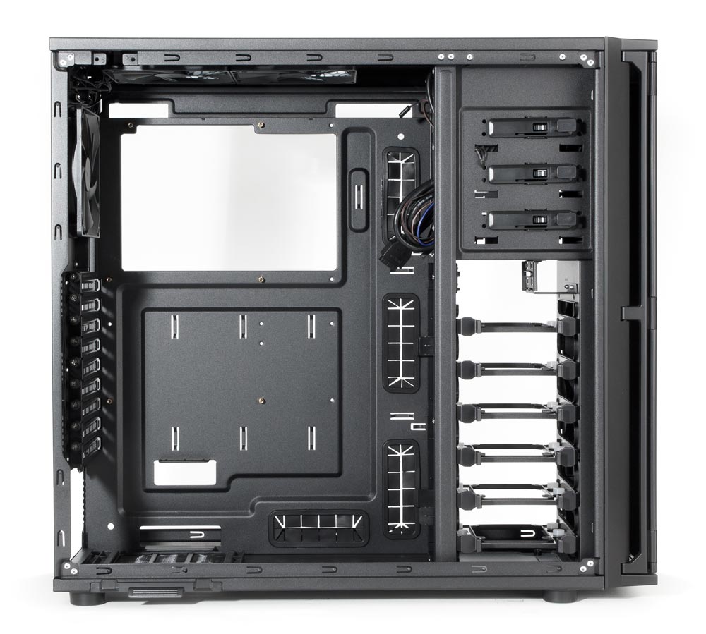 Предметом гордости фирмы в данной серии является примененная технология снижения шума Quiet Computing. Одной из ее частей является упоминавшаяся чуть выше трехслойная конструкция передней дверцы; кроме того, и боковые стенки изнутри снабжены наклейкой из поликарбоната. Это действительно интересные решения, а вот виброгасящие прокладки для HDD хотя и наличествуют в P280, но не являются сколь-нибудь эксклюзивным моментом, и тут можно отметить, что мы встречали корпуса с амортизаторами не только для дисков, но и в местах крепления вентиляторов, и на подиуме для блока питания — всего этого, к сожалению, для «героя» нашего обзора не предусмотрено.