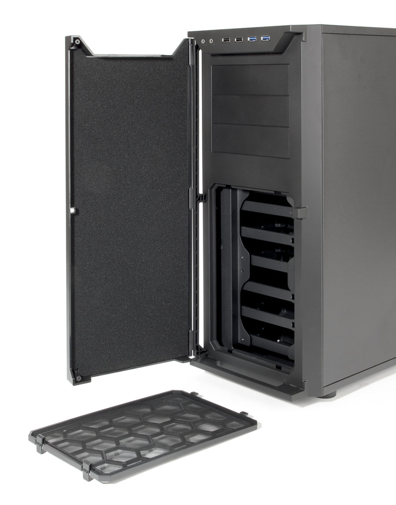 Корпус Antec P280 лучше всего подойдет для современного многоцелевого компьютера с хорошей производительностью, домашнего или офисного. Очень неплохо корпус выглядит спереди (конечно, при закрытой дверце): матовая алюминиевая панель, по бокам и снизу окаймленная тонкой черной рамкой, а сверху — узкая черная трапеция с разъемами. Строго и со вкусом. Правда, прочие элементы экстерьера ничем замечательным не отличаются, и потому корпус лучше всего устанавливать на полу или в нише компьютерного стола. Расположение разъемов и особенно кнопок явно рассчитано на «нижнюю» установку, а отсутствие отверстий в боковых стенках позволит поместить корпус даже в достаточно узкую нишу, лишь бы сверху и сзади было достаточно пространства. Единственным препятствием для установки в нишу может быть доступ к нижнему фильтру, который извлекается слева, но если блок питания расположить вентилятором вверх, то и этот момент перестанет быть актуальным.