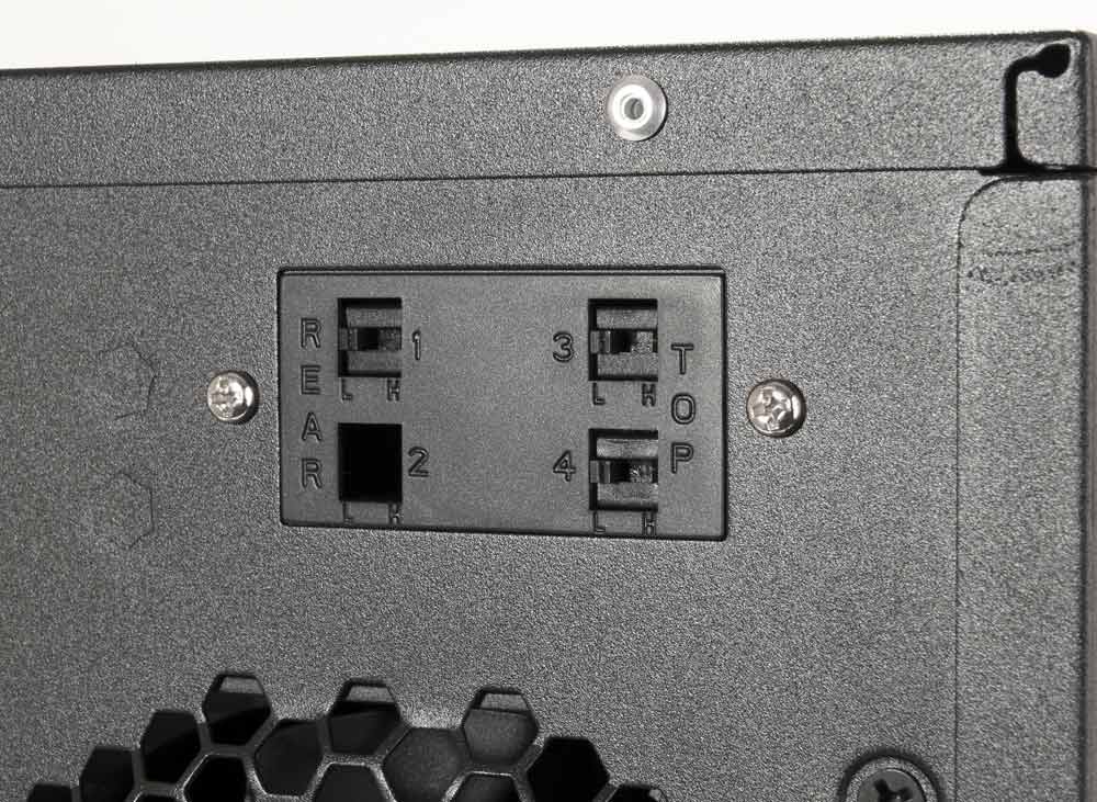 В штатную комплектацию входят два вентилятора TwoCool 120×25 мм на верхней крышке корпуса и один на задней стенке, все они без подсветки. Подключение — к трем индивидуальным двухпозиционным переключателям, позволяющим выбирать одну из двух скоростей вращения: High (1500 об/мин, создаваемый поток воздуха — 1,43 м³/мин, статическое давление 1,21 мм H2O, шум 27,9 дБА) и Low (соответственно 900 об/мин, 0,84 м³/мин, статическое давление 0,49 мм H2O, шум 16,9 dBA). В руководстве пользователя указан еще один занятный параметр: «Входящее напряжение 3,6W / 2,2W» — понятно, что это потребляемая мощность, а название параметра мы оставляем на совести составителей.
