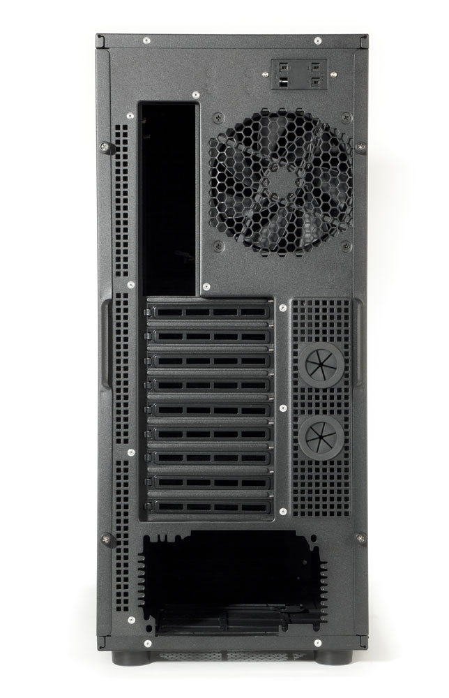 Из дополнительных вентиляционных отверстий упомянем большую сетчатую область на задней панели, в которой имеются и отверстия для трубок системы жидкостного охлаждения, закрытые резиновыми заглушками.