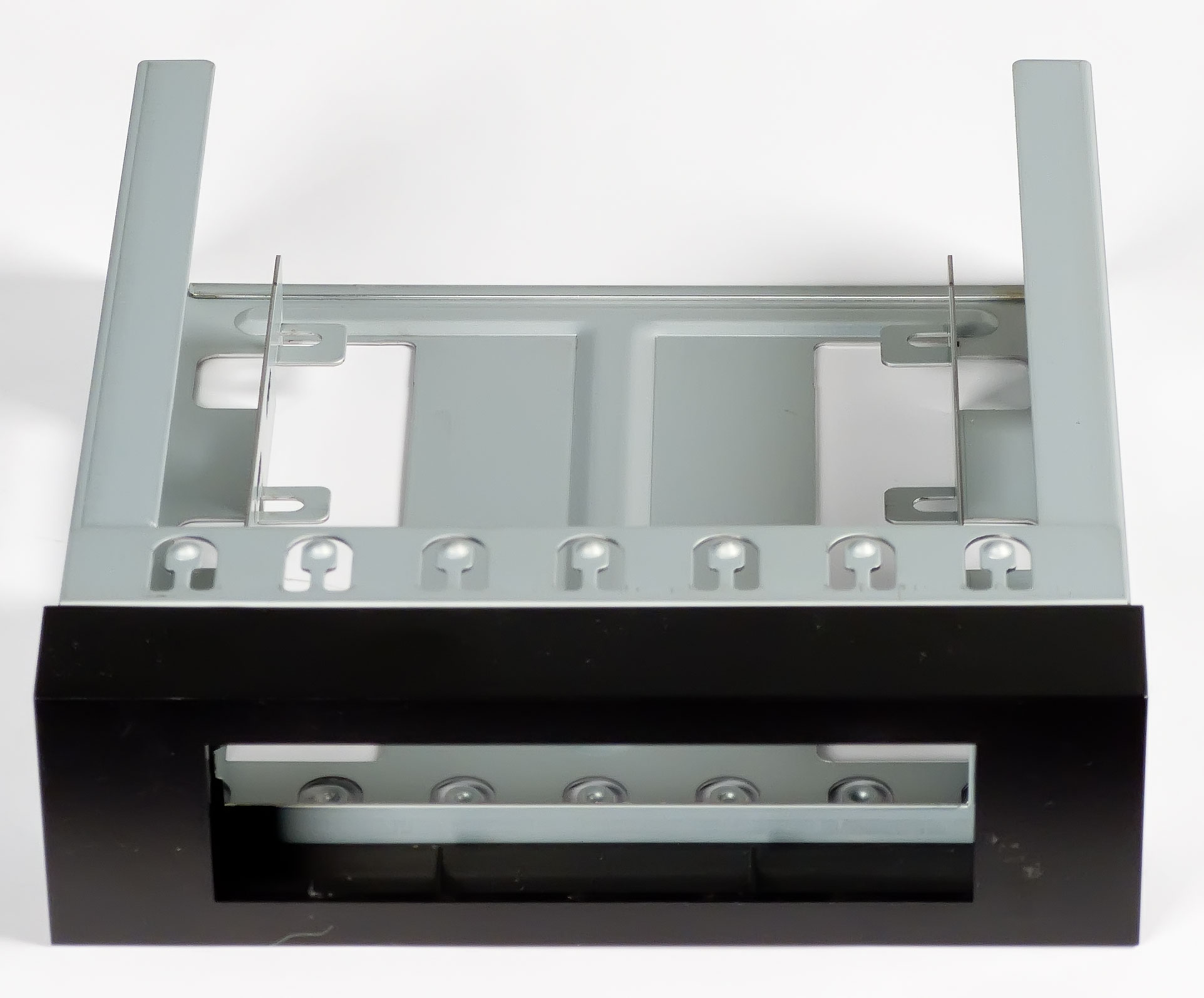 Крепление устройств типоразмера 5,25 дюйма осуществляется при помощи салазок. Интересным образом размещены указанные салазки, идущие в комплекте. Обычно их кладут в пакет, коробку или пластиковый контейнер, в данном случае салазки размещены на внутренней стороне заглушек посадочных мест передней панели, что оригинально и вместе с тем весьма удобно, так как они всегда оказываются под рукой в нужный момент.