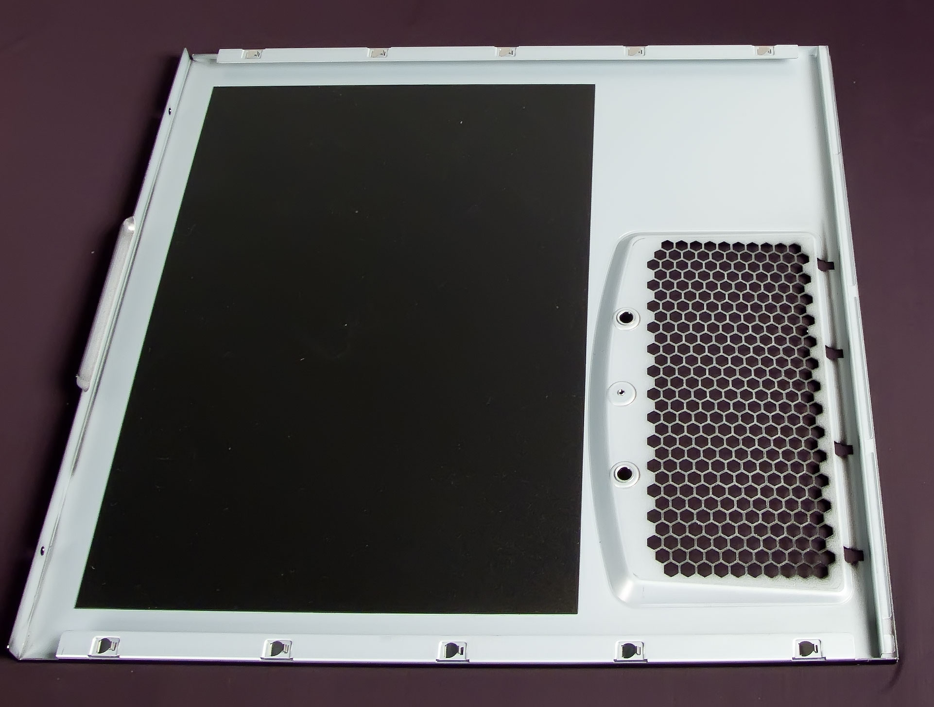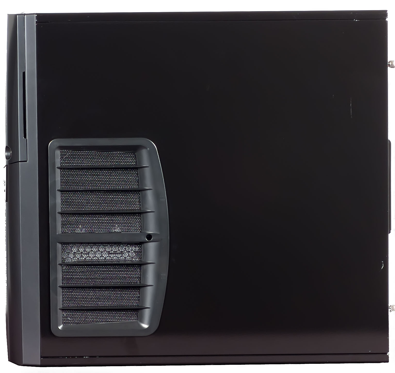 Большое вентиляционное отверстие на боковине корпуса, предназначенное для объема, где устанавливаются жесткие диски, закрыто быстросъемной рамкой с пластиковой сеткой, которую можно условно считать пылевым фильтром. Условно потому, что для полноценного фильтра отверстия все же слишком большие, хотя это и лучше, чем просто стальная решетка. Снимать конструкцию удобно, но в первый раз придется разобраться, как это делается.