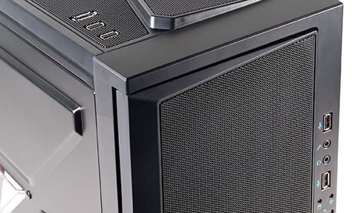 Весь черный пластик, применяемый для верхней и передней декоративных панелей, окрашен, насколько об этом можно судить визуально, в массе, благодаря чему имеет повышенную износостойкость. Заглушки под 5,25″ отсеки выполнены из относительно прочной стальной сетки, пластикового основания и плотного поролонового фильтра.