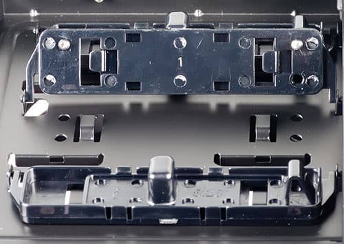 Отсек для жестких дисков и пятидюймовых устройств оборудован пластиковой системой безвинтового крепления. Конструкция нехитрая — подпружиненные пластиковые штырьки и защелка по принципу щеколды. В случае с оптическим приводом фиксацию дополнительно усиливают металлические распорки с противоположной стороны, за счет чего крепеж получается достаточно прочным, люфт в обеих плоскостях полностью отсутствует.