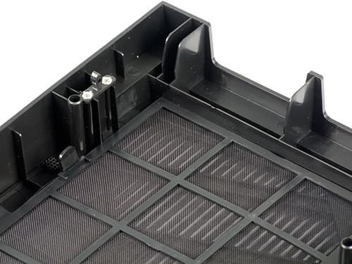 Что касается пылевых фильтров, то в А90 он всего один — на оборотной стороне передней панели. Фильтр быстро снимается и легко моется, выполнен из синтетической сетки крупного «калибра», то есть от мелкой пыли никак не защищает. К сожалению, его эффективность значительно снижается в связи с одной старой, но все еще встречающейся недоработкой: отверстие в нижней части для демонтажа передней панели находится перед вентилятором, но после данного фильтра. Благодаря чему пыль с пола успешно попадает внутрь напрямую, обходя все преграды.
