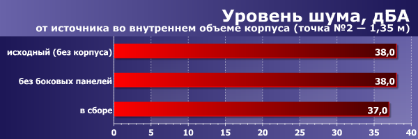 В данном случае было зафиксировано минимальное ослабление уровня шума от источника внутри корпуса, что и неудивительно при подобной конструкции с большими по площади вентиляционными отверстиями.