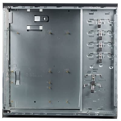 Система безвинтового крепления устройств сделана довольно просто, но вместе с тем удобно. Жесткий диск или оптический привод необходимо поместить в соответствующий отсек, совместить крепежные отверстия на шасси и самом устройстве, после чего просто опустить и прижать до щелчка металлическую защелку-крючок. По удобству получается ничуть не хуже, чем дорогая и сложная система в топовом Cooler Master Cosmos S. Правда, качество фиксации такое же плохое: сильный люфт ощущается как в горизонтальной, так и в вертикальной плоскостях. Так что четыре винта под крестовую отвертку явно будут намного эффективнее.