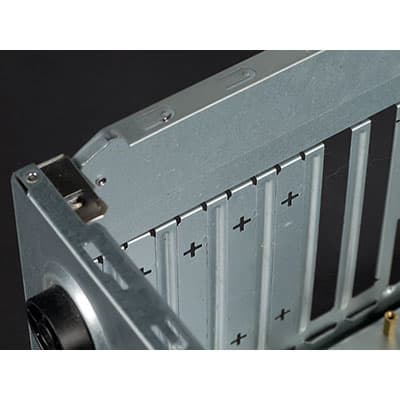 Все заглушки под платы расширения, кроме самой верхней, являются несъемными, их, при необходимости, нужно выламывать. Способ фиксации плат частично безвинтовой. Смысл в том, что на все отсеки (которых в TA-F11 семь штук) с внешней стороны корпуса прикручена одна большая фиксирующая пластина Г-образной формы, крепящаяся к корпусу одним винтом. Она обеспечивает надежную фиксацию, устанавливается и снимается достаточно быстро.