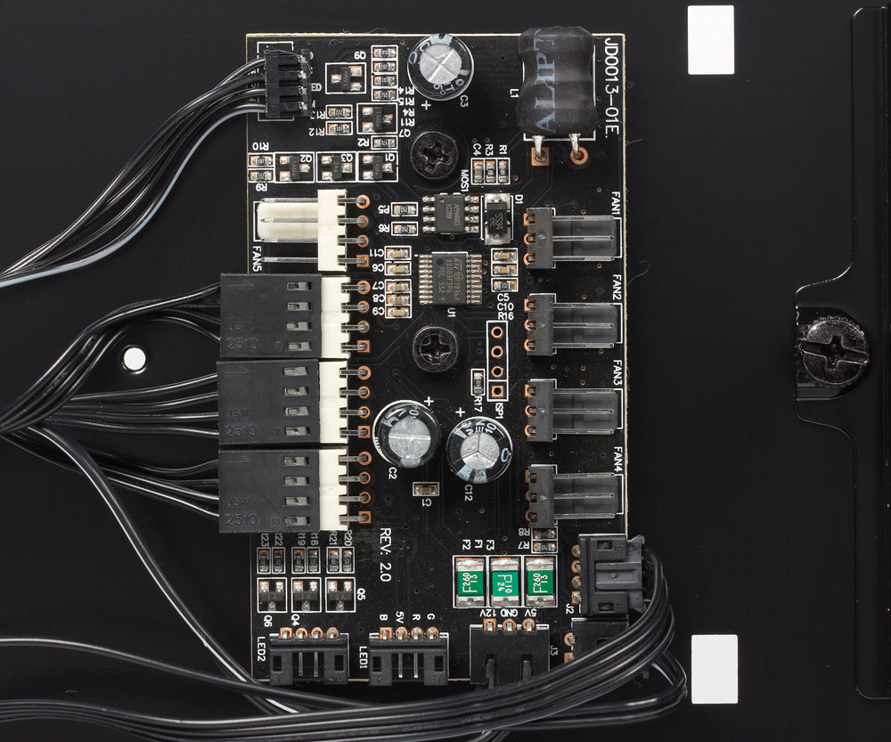 Для управления вентиляторами применено решение, всё чаще встречающееся в корпусах «высшей лиги»: подключаются они через хаб — плату, обычно расположенную за подложкой системной платы. Это мы видим и в Dark Base Pro 900.