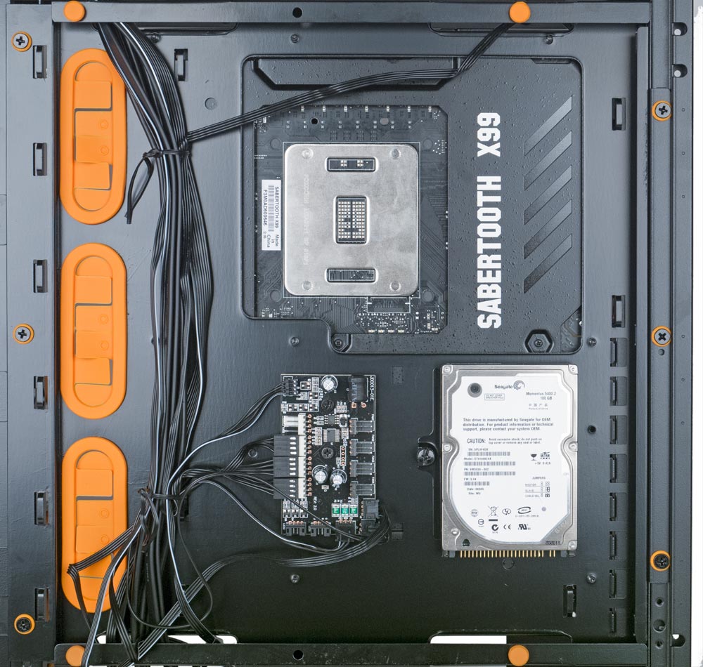 Для различных кабелей, включая интерфейсные, предусмотрено немало места за подложкой системной платы, а для прокладки есть несколько отверстий, три самых больших закрыты заглушками с разрезными лепестками. Штатные кабели, идущие от панели управления, прикреплены обычными проволочными скрутками, но не из экономии (напомним, что в комплекте есть удобные многоразовые стяжки-липучки), а потому, что это временная фиксация: при инверсии конструктива или извлечения подложки для использования ее в качестве стенда кабели всё равно придется освобождать.
