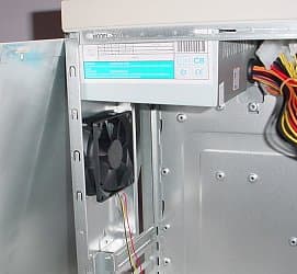 На передней панели имеется место для установки второго дополнительного вентилятора на винтах. Лицевая панель крепится на защелках и снимается полностью, так как индикаторы и кнопки крепятся к корпусу. Заглушки на задней панели для плат крепятся винтами.